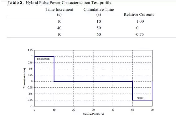 “The objective of thisprofile is to demonstrate the discharge pulse and regen pulse powercapabilities at various depth of discharge (DOD) values for both the Minimumand Maximum Power-Assist goals (10-s discharge, 10-s regen).”
