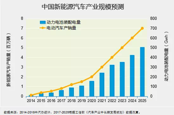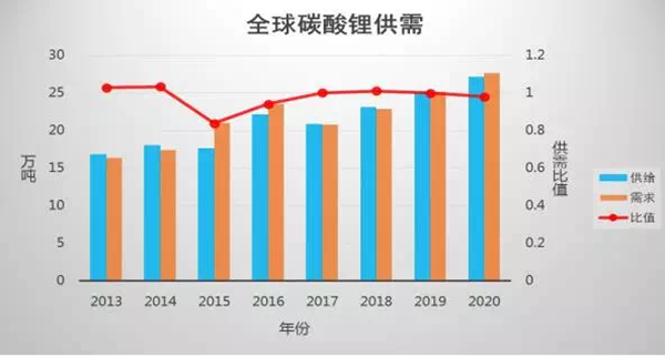 2017年,工業(yè)和信息化部、發(fā)展改革委、科技部共同印發(fā)《汽車產(chǎn)業(yè)中長期發(fā)展規(guī)劃》中指出,到2020年,新能源汽車年產(chǎn)銷達到200萬輛,到2025年我國新能源汽車銷量占總銷量的比例達到20%以上。通過折算,碳酸鋰當(dāng)量需要將增加30萬噸,鈷金屬當(dāng)量增加10萬噸。而去年全國碳酸鋰供銷為18-19萬噸,這意味著不到10年時間碳酸鋰需求將增長30萬噸。