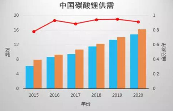 2015年,我國新能源汽車的產(chǎn)量及銷量分別達到34萬輛和33萬輛,與2014年相比產(chǎn)銷量飆升4倍,也由此帶動了碳酸鋰需求的大幅增長。從2015年開始,我國碳酸鋰需求量一直遠大于供給量。由于供求關(guān)系,目前無法提供足夠多的碳酸鋰,因此必然會導(dǎo)致價格上漲。