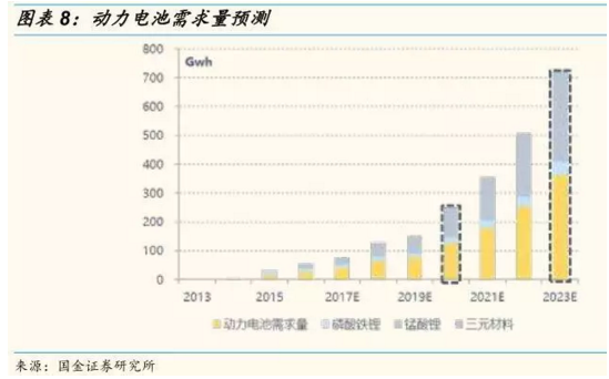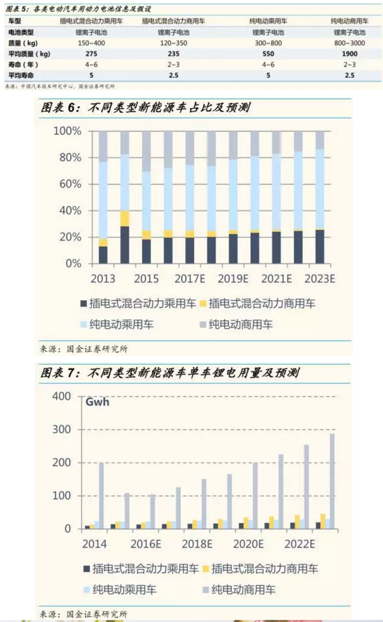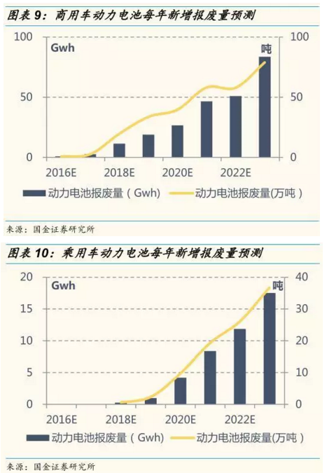 根據(jù)我們的測算,按商用車(按3 年電池壽命假設(shè))和乘用車(5 年)所使用的動力鋰電池報(bào)廢量,將在2020年分別達(dá)到27Gwh和4.2Gwh,在2023年分別達(dá)到84Gwh和17.5Gwh