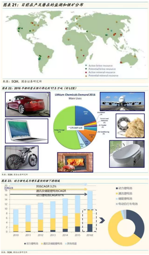 2015 年,鋰電池占全部鋰需求的 50% 以上;根據(jù) SQM 的預(yù)測,2016 年到 2025 年鋰需求的復(fù)合增速將達(dá)到 8%-12% ,其中動力鋰電的鋰需求復(fù)合增速將達(dá)到18%-24% ,根據(jù)該預(yù)測,2025 年全球鋰需求將達(dá)到 49萬噸(折 LCE )。