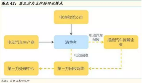 第三方回收模式 :需要獨(dú)自構(gòu)建回收網(wǎng)絡(luò)和相關(guān)物流體系,負(fù)責(zé)回收委托企業(yè)售后市場生產(chǎn)的廢舊動力電池,之后運(yùn)回回收處理中心,進(jìn)行專業(yè)化的回收處理。在電動汽車最終報(bào)廢進(jìn)入汽車拆解企業(yè)后,汽車拆解企業(yè)可以將廢舊動力電池銷售給第三方企業(yè)。