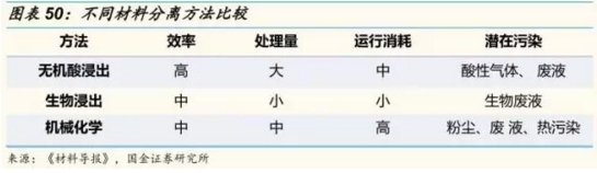 第二步:材料分離。預(yù)處理階段富集得到了正極和負(fù)極的混合電極材料,為了從中分離回收 Co 、Li 等有價(jià)金屬,需要對混合電極材料進(jìn)行選擇性提取。材料分離的過程也可以按照干法回收、濕法回收和生物回收的分類技術(shù)分為:(1)無機(jī)酸浸出;(2)生物浸出;(3)機(jī)械化學(xué)浸出。