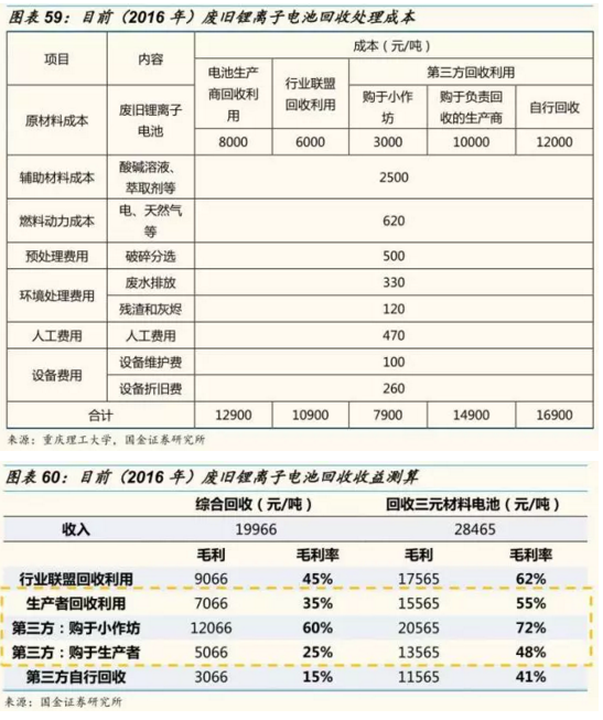 三元電池材料的回收價(jià)值較其他動力電池更高,如單獨(dú)考慮回收三元動力電池的情況,則 電池廠商 回收利用模式和向 電池廠商 購買廢舊電池的第三方拆解模式皆具備 優(yōu)質(zhì) 的 投資價(jià)值 (2016 年測算到 毛利率分別達(dá)到55% 和48%)