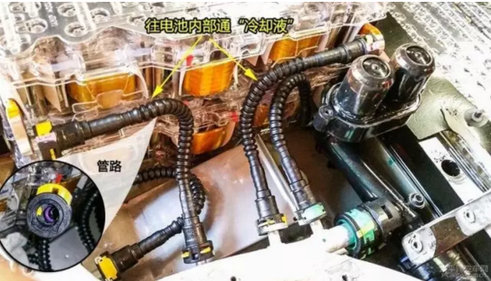 電池板的冷卻液通過管路流動(dòng)!美國(guó)電池組內(nèi)部都需要灌入冷卻液!