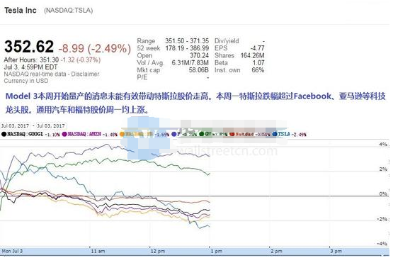 本周一,特斯拉股價(jià)并未受到Model 3的好消息感染。本周一美國(guó)科技股集體下挫,盤中創(chuàng)兩個(gè)月新低。當(dāng)日特斯拉股價(jià)高開(kāi)低走,收跌2.49%。不但表現(xiàn)遠(yuǎn)遜于通用汽車、福特這類傳統(tǒng)汽車制造巨頭,也不及Facebook等其他科技龍頭股。