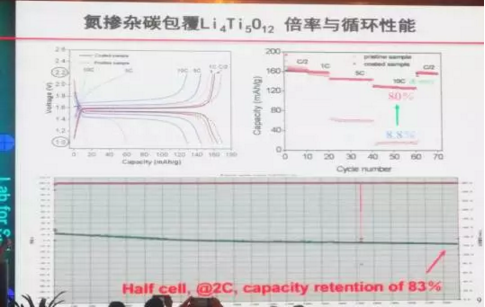 對于鈦酸鋰電池的缺點,專家們提出了很多改進方案。復(fù)旦大學(xué)夏永姚教授提出用離子摻雜和碳包覆的方法提高電子電導(dǎo)率;用表面處理和采用SEI膜電解液添加劑的方法改進電池產(chǎn)氣問題。除這兩種方法之外,中科院物理所的胡勇勝教授還提出用表面氮化的方法。胡教授通過實驗證明,氮摻雜包覆可增強Li4Ti5O12的表面穩(wěn)定性與導(dǎo)電性,因為其表面形成Ti-N-C,有助于電荷的轉(zhuǎn)移;構(gòu)筑的三維混合導(dǎo)電網(wǎng)絡(luò)提升了Li在電極中的脫嵌速率。
