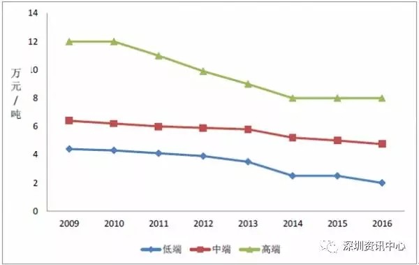 2009-2016年動(dòng)力鋰電池負(fù)極材料的價(jià)格走勢(shì)