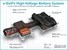 2015版e-Golf電池包是一個典型的“土”字形結構,充分利用了整車上可以利用的空間??傠娏繛?4.2kWh,總電壓為320V,容量為75Ah,電池包重量為313kg,體積為229.4 L。2016年起,大眾選用新的三元電芯,在原有體積不變的情況下,電池包的總電量達到35.8kWh,整車的續(xù)航里程也從134公里提升至200公里。