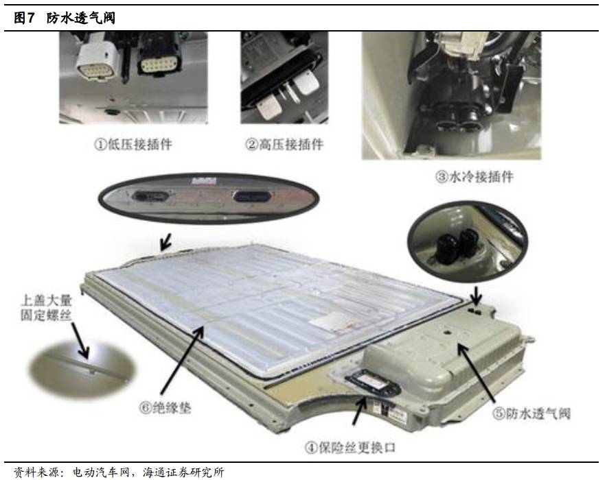 為了保護(hù)電池組,特斯拉在電池組前部頂面上設(shè)計(jì)了防水透氣閥,利用氣體分子與液體及灰塵顆粒的體積大小數(shù)量級(jí)之差,讓氣體分子通過(guò),而液體、灰塵無(wú)法通過(guò),從而實(shí)現(xiàn)防水透氣的目的,避免水蒸氣在電池組內(nèi)部凝結(jié)。