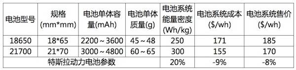 今年初特斯拉披露的信息來看,在現(xiàn)有條件下,其生產(chǎn)的21700電池系統(tǒng)的能量密度在300Wh/kg左右,比其原來18650電池系統(tǒng)的250Wh/kg約提高20%。電池單體電池容量的提升意味著同等能量下所需電芯的數(shù)量減少約1/3,如此以來降低了系統(tǒng)管理難度、簡化金屬結(jié)構(gòu)件等配件數(shù)量,雖然單個電芯的重量和成本提升了,但是電池系統(tǒng)PACK的重量和成本卻得到了降低。