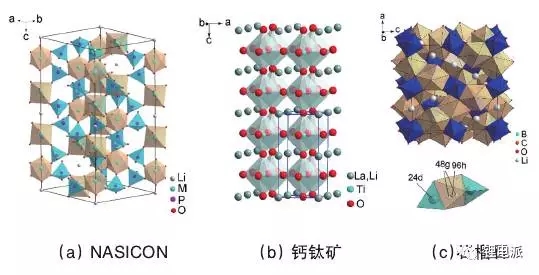 在氧化物中,鋰離子在尺寸大得多的O2-構(gòu)成的骨架結(jié)構(gòu)間隙進行傳導,減弱Li-O相互作用、實現(xiàn)鋰離子的三維傳輸及優(yōu)化傳輸通道中鋰離子與空位濃度的比例均有利于提高鋰離子的電導率。基于這些理念,一些具有復雜結(jié)構(gòu)的氧化物鋰離子導體材料相繼出現(xiàn),其中具有代表性的包括石榴石型結(jié)構(gòu)體系、鈣鈦礦結(jié)構(gòu)體系、鈉快離子導體結(jié)構(gòu)體系。然而,這些材料中,只有石榴石型結(jié)構(gòu)體系的材料對金屬鋰穩(wěn)定。另兩種結(jié)構(gòu)體系中電導率較高的材料均含有可被金屬鋰還原的Ti、Ge等元素。此外,石榴石型結(jié)構(gòu)體系材料對空氣有較好的穩(wěn)定性,原料成本低,燒結(jié)體具有較高的機械強度,因此具備作為理想固態(tài)電解質(zhì)廣泛應用于全固態(tài)鋰電池的潛力。
