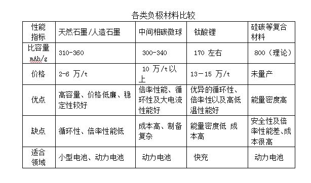 當前主要使用的負極材料是天然石墨和人造石墨,其中天然石墨主要使用在 3C 領(lǐng)域,而人造石墨主要使用在動力領(lǐng)域。傳統(tǒng)石墨材料的能量密度上限在 372 mAh/g,較當前正極材料的能量密度還有相當?shù)脑A俊J芪磥砟芰棵芏纫约皠恿﹄姵馗弑堵史烹姷囊?,盡管價格昂貴或技術(shù)尚不成熟,中間相碳微球(MCMB)、鈦酸鋰以及硅基負荷材料等高端負極材料逐漸進入到了對性能要求較全面且較高的電池負極材料應(yīng)用中去。具體這幾種高端負極與天然石墨及人造石墨材料的特性以及優(yōu)缺點比較如下表所示。