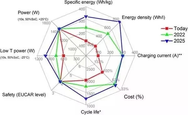 圖1 現(xiàn)有動力電池的技術(shù)指標以及未來10 年的發(fā)展目標