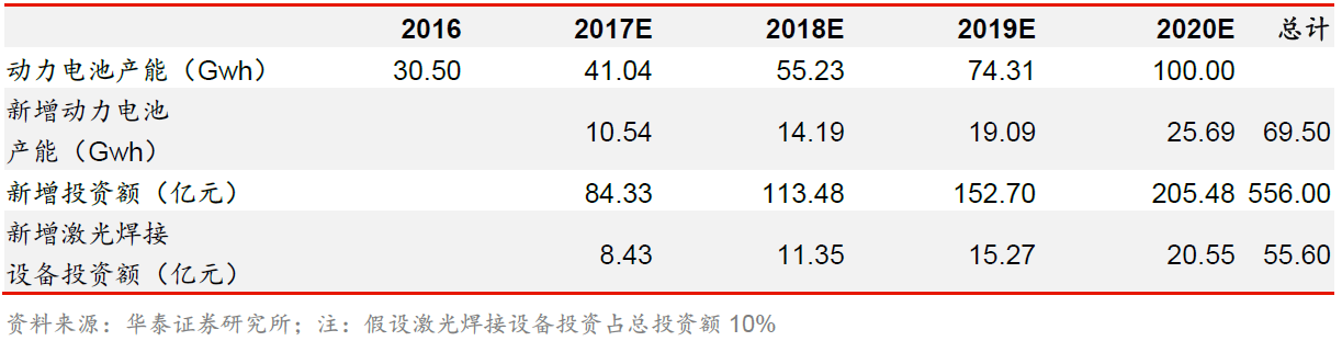 十三五規(guī)劃期間顯示動(dòng)力電池投資額將達(dá)到560億元,對(duì)應(yīng)激光設(shè)備需求56億元。假設(shè)國(guó)家將在2020年達(dá)到《促進(jìn)汽車動(dòng)力電池產(chǎn)業(yè)發(fā)展行動(dòng)方案》中目標(biāo),那么在2017年到2020年間,國(guó)內(nèi)動(dòng)力電池新增產(chǎn)能約為70Gwh。根據(jù)部分動(dòng)力電池項(xiàng)目的投資情況不完全統(tǒng)計(jì),每Gwh新增產(chǎn)能對(duì)應(yīng)的投資額約為8億元,而激光焊接設(shè)備在動(dòng)力電池廠投入中占比5至15%,則到2020 年國(guó)內(nèi)動(dòng)力電池廠新增設(shè)備需求約為28至84 億元。