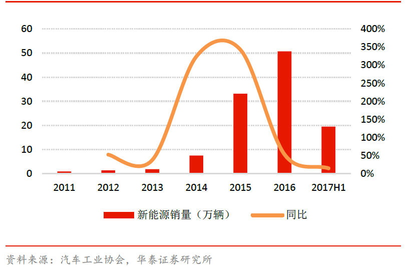 新能源汽車需求持續(xù)增長(zhǎng),推動(dòng)動(dòng)力電池行業(yè)擴(kuò)張。受新能源汽車補(bǔ)貼減少影響,2017年上半年國(guó)內(nèi)新能源汽車銷量為19.5 萬(wàn)輛,同比僅增長(zhǎng)14.71%,預(yù)計(jì)全年可完成銷量約70萬(wàn)輛。但2016年10月底工信部發(fā)布的《節(jié)能與新能源汽車技術(shù)路線圖》提出,至2020年新能源汽車銷量占汽車總體銷量的比例達(dá)到7%以上;至2025 年新能源汽車銷量占汽車總體銷量的比例達(dá)到20%以上;至2030 年新能源汽車銷量占汽車總體銷量的比例達(dá)到40%以上。汽車電動(dòng)化的大趨勢(shì)較為確定,動(dòng)力電池增長(zhǎng)確定。
