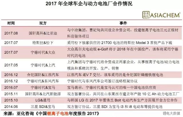 資料顯示,為了保證新能源汽車(chē)所使用動(dòng)力電池的技術(shù)匹配、供應(yīng)穩(wěn)定和價(jià)格合理,全球車(chē)企一方面加強(qiáng)了與動(dòng)力電池企業(yè)的合作,另一方面尤為重要的是,全球領(lǐng)軍車(chē)企紛紛選擇自建動(dòng)力電池工廠。2017年全球車(chē)企與動(dòng)力電池廠合作情況如下表所示。
