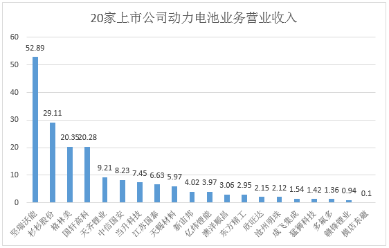 在22家動力電池企業(yè)中,除了佛塑科技和德賽電池外,其他20家企業(yè)的半年報中均有提及動力電池營業(yè)收入情況。沃特瑪動力電池業(yè)務營業(yè)收入最高,達52.89億元,同比增長128.31%。