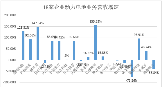 在營業(yè)收入增速方面,18家企業(yè)的半年報中提及動力電池營業(yè)收入增減情況。億緯鋰能、格林美、堅瑞沃能營收同比增長超1倍。國軒高科、天賜材料、欣旺達、滄州明珠、成飛集成、贛鋒鋰業(yè)營業(yè)收入均有不同程度的下降。