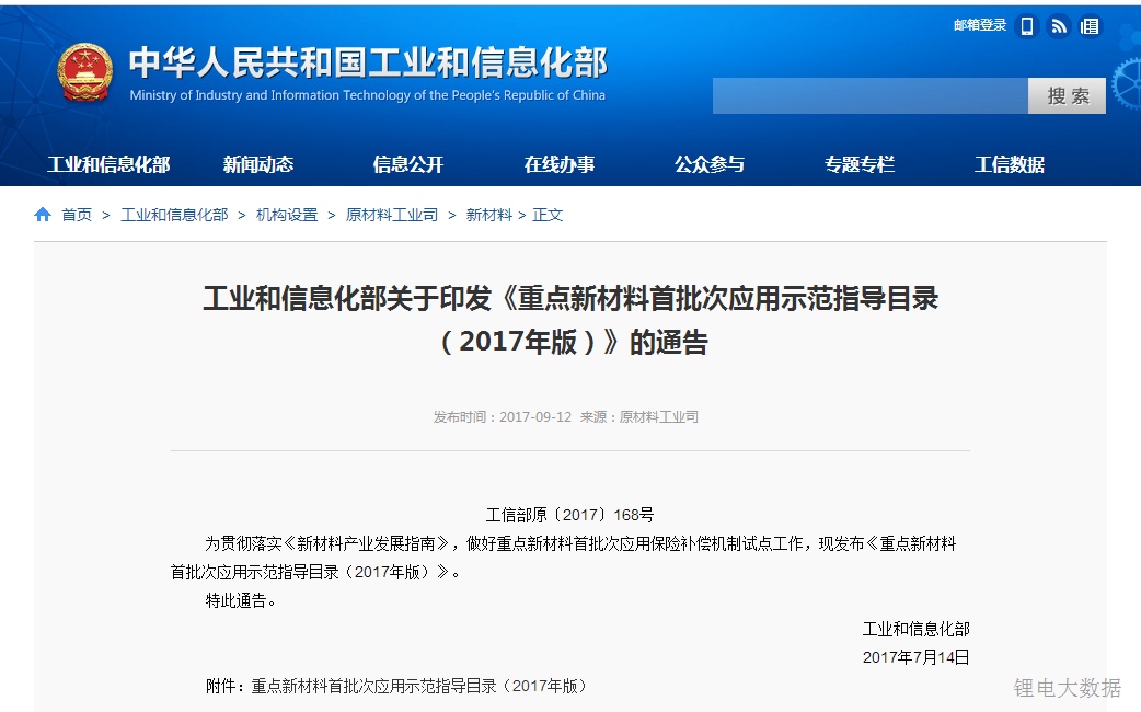 中國儲能網(wǎng)訊:9月12日,工信部發(fā)布《重點新材料首批次應(yīng)用示范指導(dǎo)目錄(2017年版)》(以下簡稱《目錄》),鋰電池材料行業(yè)迎來新一輪的機遇與挑戰(zhàn)。