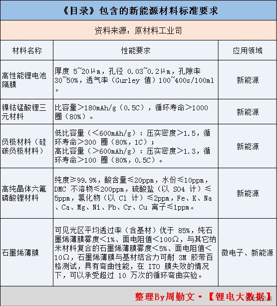 經(jīng)鋰電大數(shù)據(jù)梳理發(fā)現(xiàn),其中涉及新能源領(lǐng)域的新材料共有5項,包括高性能鋰電池隔膜、鎳鈷錳酸鋰三元材料、負極材料、高純晶體六氟磷酸鋰材料和石墨烯薄膜。
