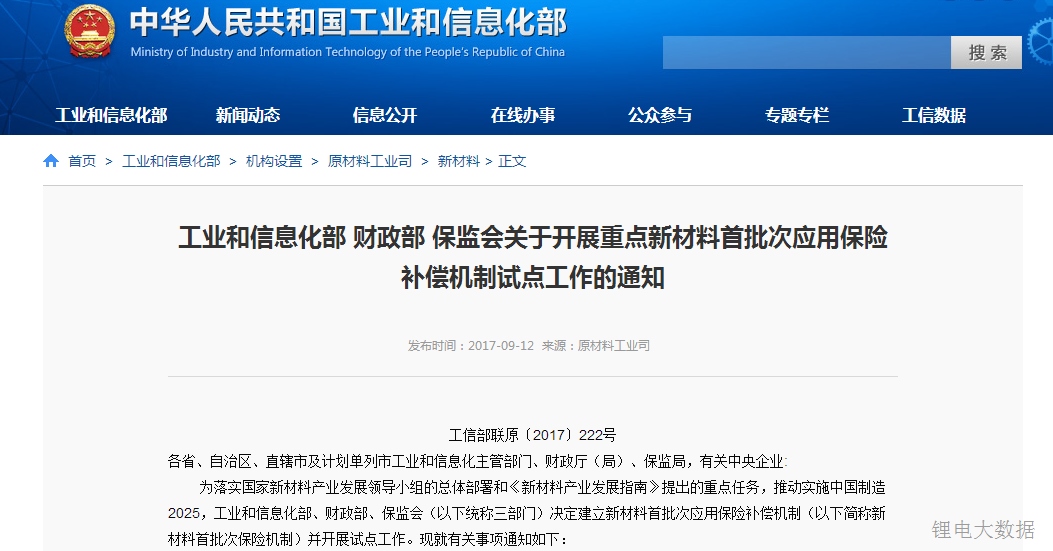 除發(fā)布《目錄》外,工業(yè)和信息化部、財政部、保監(jiān)會三部委共同發(fā)布《關(guān)于開展重點新材料首批次應(yīng)用保險補償機制試點工作的通知》(以下簡稱《通知》)。