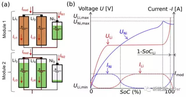 其工作原理如下圖所示,用于均衡的NiMH電池或者Ni-Zn電池通過(guò)并聯(lián)的方式與鋰離子電池連接在一起,當(dāng)電池組中的一組串聯(lián)低容量電池充滿電后,電壓達(dá)到閥值,此時(shí)與之并聯(lián)的NiMH電池承擔(dān)起了分流的作用,所有的電流基本上都流過(guò)NiMH電池,不再流過(guò)鋰離子電池,從而避免了鋰離子電池發(fā)生過(guò)充。在這個(gè)過(guò)程中鋰離子電池和NiMH電壓和電流的變化如下圖b所示,在完美匹配的情況下,鋰離子電池電流如紅色曲線所示。
