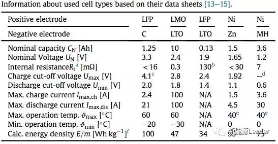 下表為實(shí)驗(yàn)中使用到的電池的信息,實(shí)驗(yàn)中主要用到了LFP/石墨,LMO/LTO,LFP/LTO,Ni-Zn和NiMH電池。