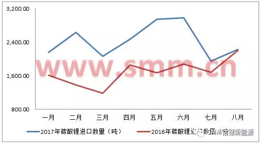 圖一:2016/2017年1-8月碳酸鋰進口數(shù)量趨勢圖(來源:海關信息網(wǎng),SMM)