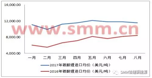 圖二:2016/2017年1-8月碳酸鋰進口均價趨勢圖(來源:海關信息網(wǎng),SMM)
