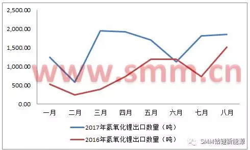 圖三:2016/2017年1-8月氫氧化鋰進口數(shù)量趨勢圖(來源:海關信息網(wǎng),SMM)