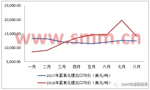 圖四:2016/2017年1-8月氫氧化鋰進口均價趨勢圖(來源:海關信息網(wǎng),SMM)