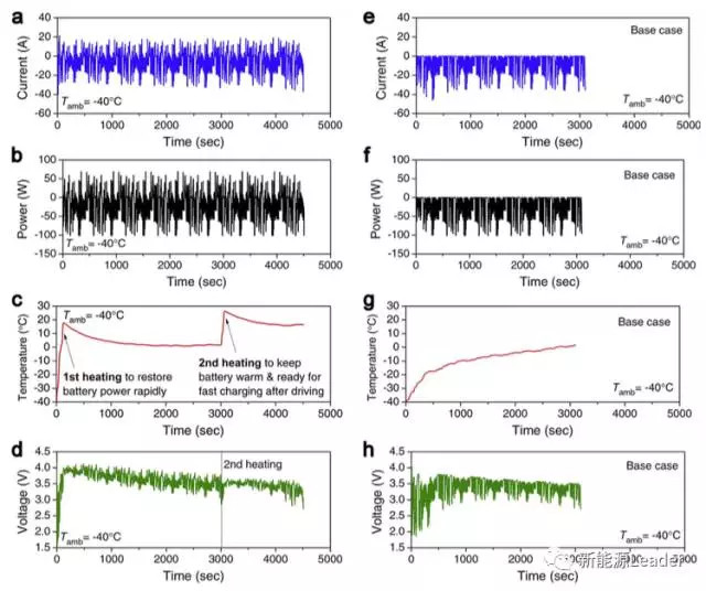 下圖為使用自加熱電池和使用普通電池的對(duì)照組在-40℃下使用過(guò)程中的電流、功率、電池溫度和電池電壓等數(shù)據(jù)曲線,其中左邊為采用自加熱電池的實(shí)驗(yàn)組,右邊為空白對(duì)照組。從電池溫度上看(圖c實(shí)驗(yàn)組,圖g對(duì)照組),自加熱電池的溫度升高速度要遠(yuǎn)遠(yuǎn)快于對(duì)照組,實(shí)驗(yàn)組緊緊用了112s就恢復(fù)到了20℃,并且實(shí)現(xiàn)了全部的剎車能量的回收,而對(duì)照組電池用了3000s,溫度才恢復(fù)到了0℃,從而導(dǎo)致無(wú)法回收剎車能量。
