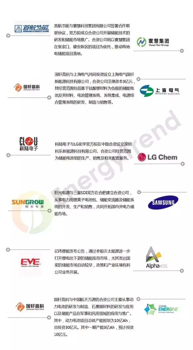目前市場上出現(xiàn)的儲能企業(yè)多數(shù)為合資公司,便是上述談到的第三種企業(yè),合資、參股的方式可以充分發(fā)揮戰(zhàn)略合作雙方資源優(yōu)勢,共享電池技術(shù)、儲能系統(tǒng)、銷售網(wǎng)絡(luò)等,共同將優(yōu)勢技術(shù)用于儲能細(xì)分市場,LG化學(xué)、三星SDI、億緯鋰能、國軒高科均采用了這一方式。下圖是部分廠家的合作方式舉例。