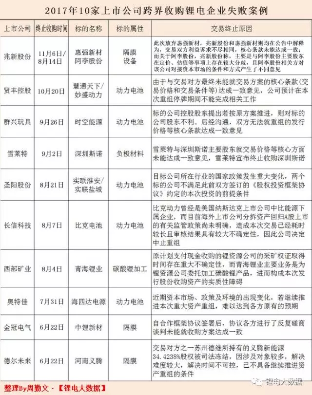 鋰電大數(shù)據(jù)梳理2017年10起并購(gòu)失敗案例如下: