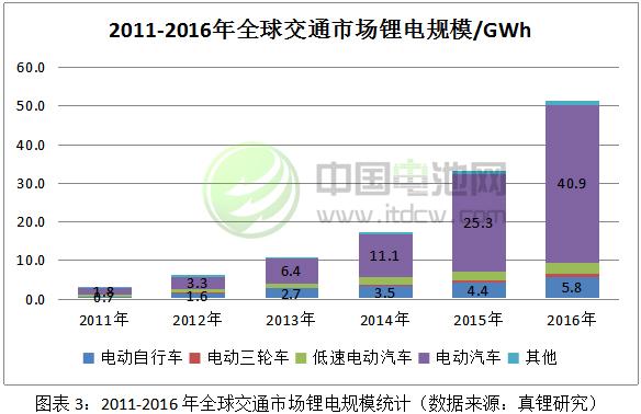 以電動(dòng)汽車為代表的交通市場(chǎng)自2011年電動(dòng)汽車商業(yè)化元年以來(lái)高速增長(zhǎng),成為鋰電市場(chǎng)發(fā)展的最大動(dòng)力。2011年交通市場(chǎng)規(guī)模僅有2.9GWh,占比9.8%,到2016年發(fā)展到51.3GWh,是2011年的17倍多,年均增速77.3%,占比也因此迅速上升到38.3%。需要提及的是,電動(dòng)汽車市場(chǎng)的高速發(fā)展,生產(chǎn)汽車電池過(guò)程中所產(chǎn)生的次品電池,一部分進(jìn)入到了電動(dòng)自行車、電動(dòng)三輪車以及低速電動(dòng)汽車等其他交通市場(chǎng),直接帶動(dòng)了這些細(xì)分市場(chǎng)的鋰電需求。