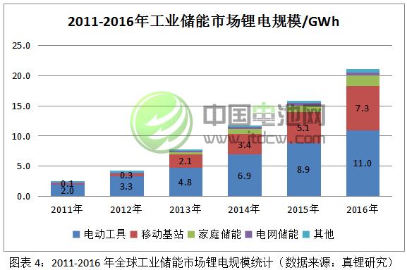 工業(yè)儲(chǔ)能市場(chǎng)的發(fā)展目前還主要依賴于電動(dòng)工具和移動(dòng)基站電源這兩個(gè)細(xì)分市場(chǎng)。圖表4顯示,電動(dòng)工具市場(chǎng)的占比2011年以來(lái)逐年下降:2011年電動(dòng)工具市場(chǎng)以2.0GWh占比83.2%,到2016年以11.0GWh占比52.0%。不過(guò),電動(dòng)工具市場(chǎng)鋰離子電池已基本完成了對(duì)鎳鎘電池等其他二次電池的替代,以后的市場(chǎng)增長(zhǎng)空間將非常有限。移動(dòng)基站電源市場(chǎng)2013年開(kāi)始快速發(fā)展,到2016年以7.3GWh占比34.8%,這與中國(guó)電動(dòng)汽車市場(chǎng)的爆發(fā)基本同步,不少汽車電池次品在這個(gè)市場(chǎng)實(shí)現(xiàn)了應(yīng)用。