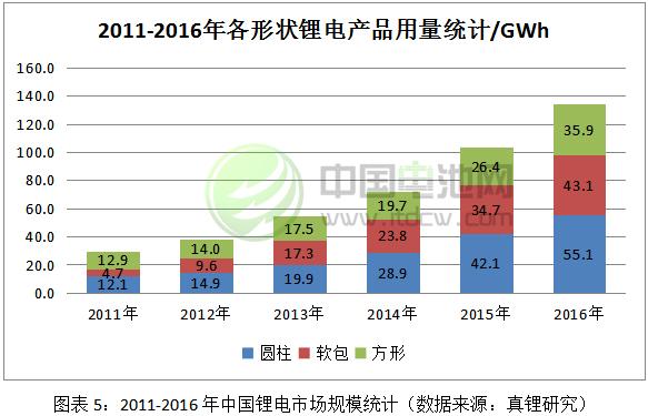 對(duì)全球鋰電市場(chǎng)規(guī)模的統(tǒng)計(jì),難點(diǎn)在于中國(guó)市場(chǎng)次品的流通規(guī)模到底有多大,很難準(zhǔn)確評(píng)估。經(jīng)過(guò)這幾年的摸索,我們找到了一些辦法,同時(shí)對(duì)前幾年的市場(chǎng)規(guī)模統(tǒng)計(jì)做了一定的調(diào)整。按照新的統(tǒng)計(jì)辦法,真鋰研究認(rèn)為,2016年全球鋰電市場(chǎng)規(guī)模高達(dá)134GWh,同比增長(zhǎng)29.8%;2011年以來(lái),鋰電市場(chǎng)規(guī)模年均復(fù)合增長(zhǎng)率高達(dá)35.2%。在全球經(jīng)濟(jì)總體尚處低谷的情況下,鋰電的發(fā)展是難得的亮點(diǎn)之一。