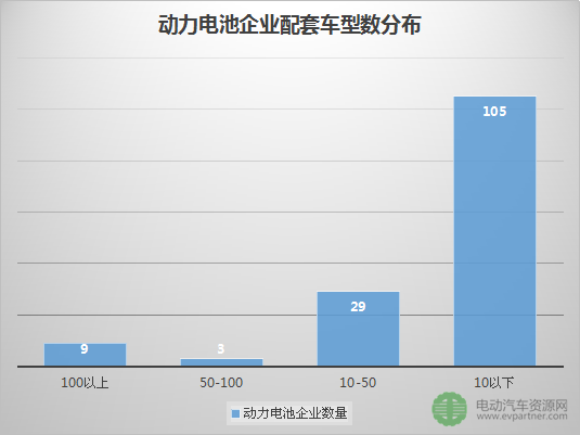 雖然同在一張表上,但是各企業(yè)配套的新能源車型數(shù)目卻有天壤之別。經(jīng)電動汽車資源網(wǎng)統(tǒng)計,配套車型數(shù)在100個以上的動力電池企業(yè)有9家,占比6.2%;配套車型數(shù)在50-100個的動力電池企業(yè)有3家,占比2.1%;配套車型數(shù)在10-50個的動力電池企業(yè)有29家,占比19.9%;配套車型數(shù)在10個以下的動力電池企業(yè)最多,有105家,占比高達71.9%。