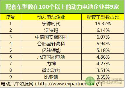 哪家動力電池企業(yè)配套的車型個數(shù)最多?根據(jù)電動汽車資源網(wǎng)統(tǒng)計,寧德時代配套車型數(shù)在500個以上,配套車型數(shù)占比接近20%,在配套車型數(shù)量方面遙遙領(lǐng)先。除此以外,還有8家動力電池企業(yè)的配套車型數(shù)在100至200個之間,分別為:沃特瑪、中信國安盟固利、國軒高科、億緯鋰能、北京國能、力神、微宏動力、比亞迪,配套車型數(shù)占比在3%-7%之間。以上9家企業(yè)配套車型總數(shù)占比達58.42%。其余137家動力電池企業(yè)配套車型數(shù)均在100個以下。