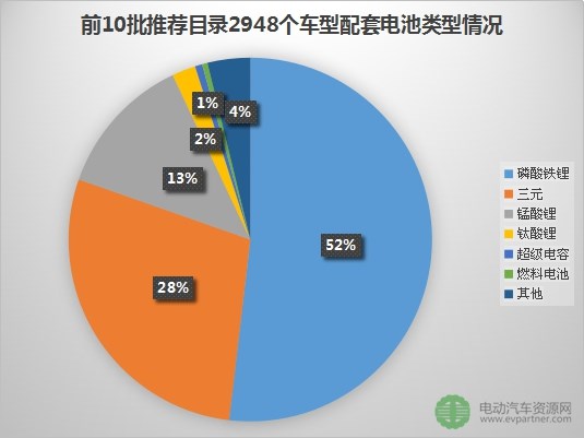 從動力電池類型看,進入前10批推薦目錄的2948個車型中,搭載磷酸鐵鋰電池的車型占比近52%;三元材料電池占比約28%;錳酸鋰電池占比近13%;鈦酸鋰電池占比約2%;超級電容占比約0.63%;燃料電池占比約0.47%;其他(含未標注具體類型的電池)占比近4%。