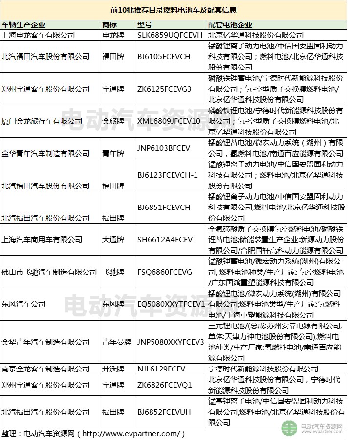 燃料電池是我國汽車動力系統(tǒng)轉(zhuǎn)型升級和新能源汽車戰(zhàn)略的重要方向,其市場潛力巨大,被認為是汽車行業(yè)下一片藍海。經(jīng)電動汽車資源網(wǎng)統(tǒng)計,前10批推薦目錄中燃料電池車有14款,配套燃料電池的企業(yè)主要為北京億華通科技股份有限公司、南通百應(yīng)能源有限公司、廣東國鴻重塑能源科技有限公司、上海重塑能源科技有限公司、新源動力股份有限公司等。