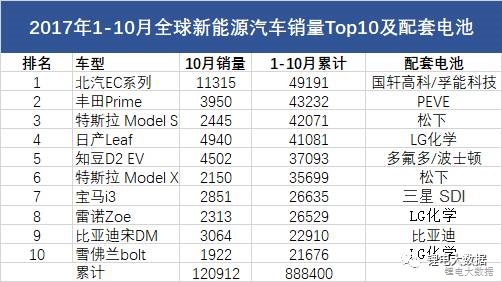 中國儲能網訊:EV Sales發(fā)布的數據顯示,2017年10月全球新能源銷量增長再創(chuàng)新高,超過12萬輛,達到120912輛,同比增長84%,1-10月累計銷量達到888400輛,同比增長51%。