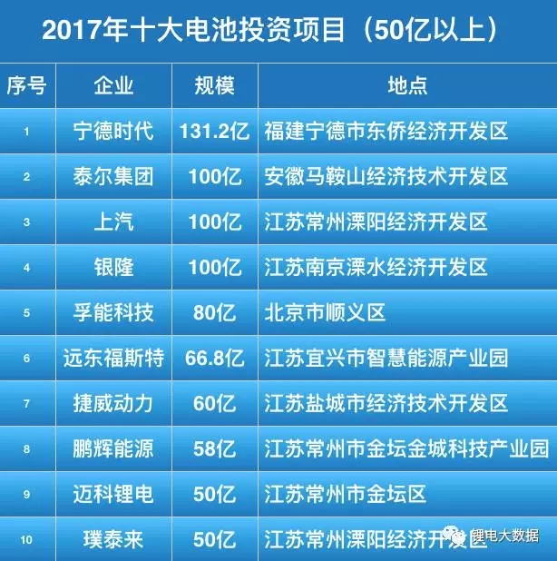 中國儲能網(wǎng)訊:受到新能源汽車快速發(fā)展的影響,2017年鋰電行業(yè)資本動作頻頻,新建、擴(kuò)產(chǎn)項目投資火爆,下面盤點(diǎn)了2017年超過50億的投資項目。