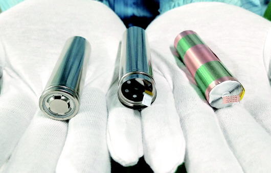 從右到左分別是電池電芯、電芯裝入鋼殼內(nèi)和“蓋帽”后的電池。