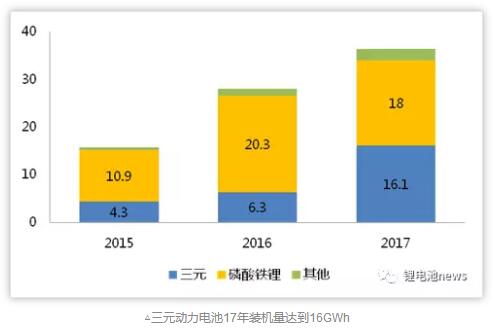 根據(jù)節(jié)能與新能源汽車網(wǎng)合格證數(shù)據(jù)顯示,我國2017年動力電池裝機(jī)量約為36.39GWh,其中三元動力電池裝機(jī)量16.05GWh,同比增長155%;占比達(dá)到44%,市場占有率實(shí)現(xiàn)翻倍增長。