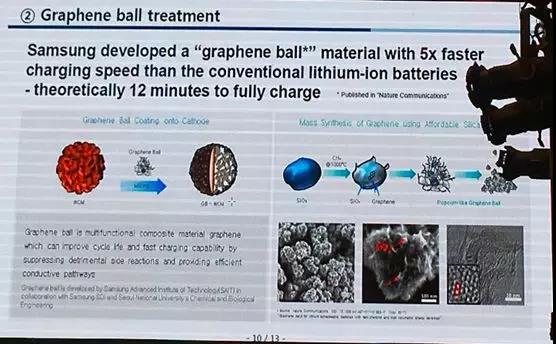 在今年的CES展上,三星SDI展示一個名為“石墨烯球(grapheneballs)”的技術,能使電池容量增加45%,充電速度提高5倍,在12分鐘內充滿電。