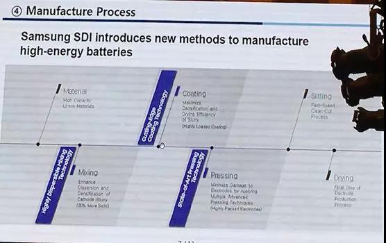 在材料工藝方面,三星采用NCA材料,因為鋰離子在循環(huán)往復的使用過程中,容易在NCA表面形成一些殘留,會影響它的使用壽命。三星通過在NCA表面做一層金屬的涂布,減少殘留,提高它的使用壽命。