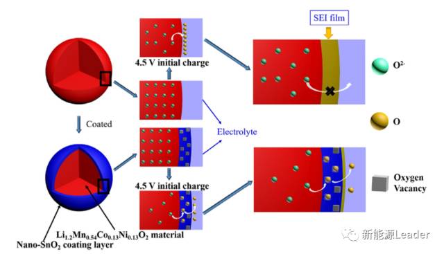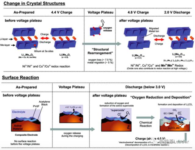 富鋰材料容量高,并且還具有低成本的優(yōu)勢,可以說是非常理想的鋰離子電池正極材料,當(dāng)然任何事情都不可能是完美的,在首次使用的過程中為了發(fā)揮出富鋰材料的高容量,要采用高電壓活化,這一過程中除了形成我們需要的Li2MnO3物相外,也會生成Li2O,還會釋放活性氧,這不僅會破壞富鋰材料自身的結(jié)構(gòu),還會導(dǎo)致電解液的氧化分解,造成較高的不可逆容量。