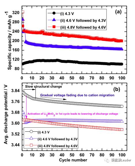 例如他們發(fā)現(xiàn)Li1.17Ni0.25Mn0.58O2在經(jīng)過4.8V活化,并在2.3-4.6V之間循環(huán)的電池,雖然容量高達(dá)242mAh/g,但是循環(huán)性能很差,并且循環(huán)100次后電壓平臺從3.62V衰降到了3.55V,而經(jīng)過4.6V活化,并在2.3V-4.3V之間循環(huán)的電池,雖然比容量較低僅為160mAh/g,但是循環(huán)性能優(yōu)異,并且循環(huán)100次未出現(xiàn)平臺電壓衰降,如下圖所示,而沒有經(jīng)過高電壓活化的材料,容量較低僅為100mAh/g左右,可見富鋰材料的活化制度和循環(huán)制度對于富鋰材料的循環(huán)具有巨大的影響。